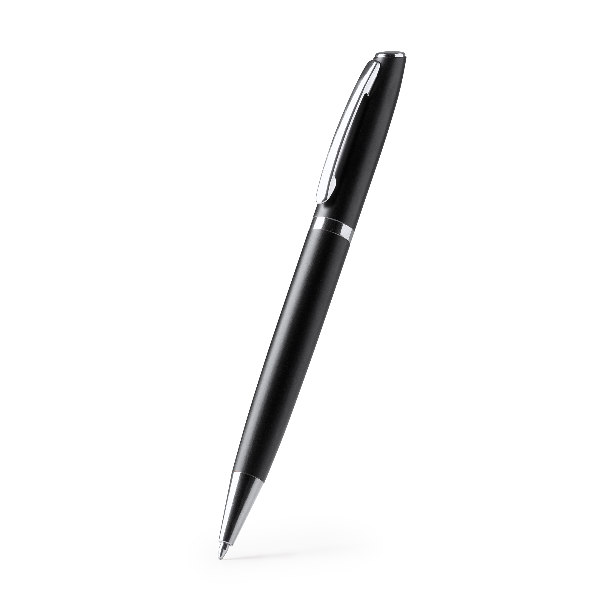 Elegante bolígrafo giratorio con cuerpo de aluminio reciclado y detalles metalizados. Un bolígrafo concienciado con el medioambiente. Carga jumbo de tinta azul.