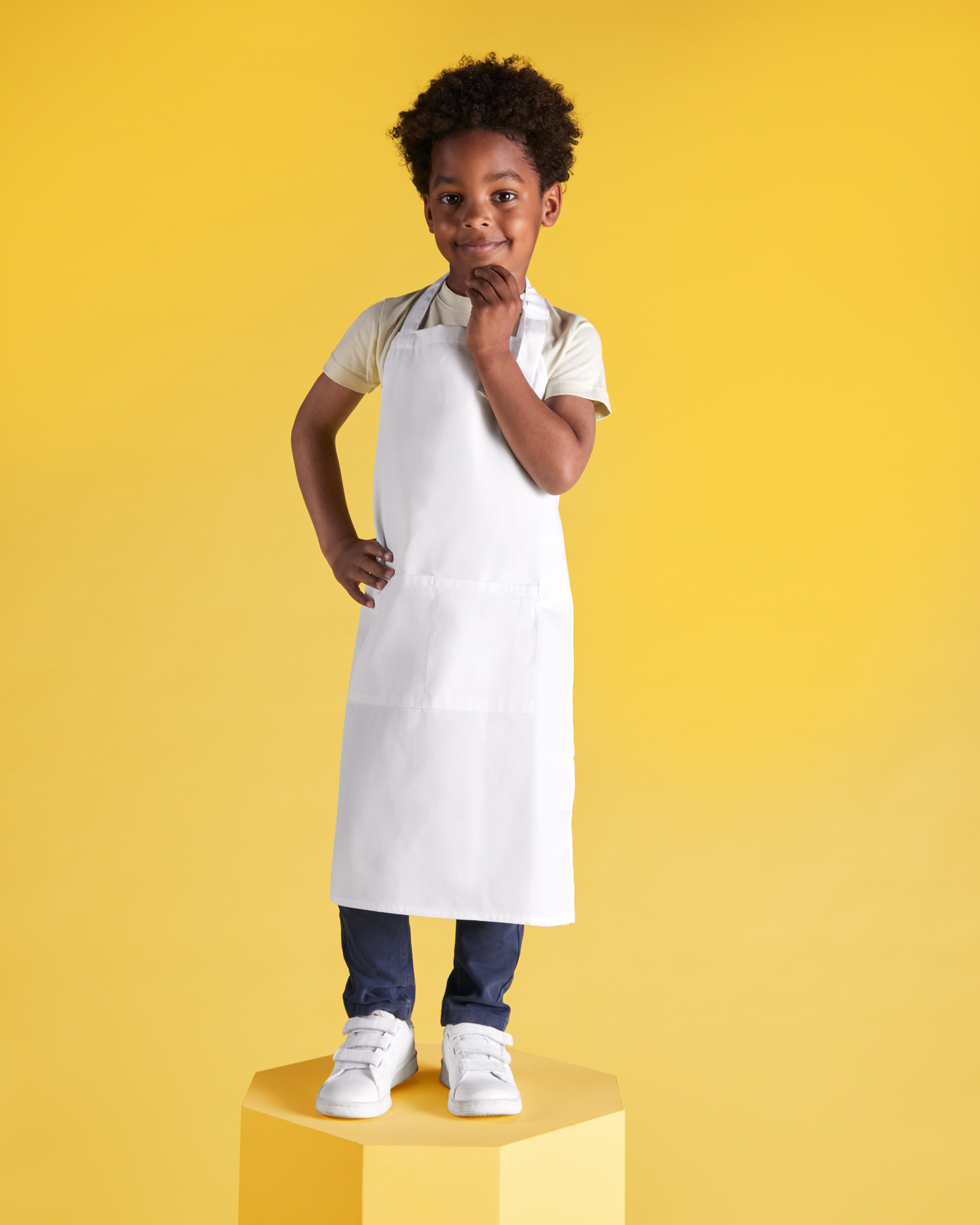 Delantal largo de sarga.· Tirante con cierre ajustador de plástico. · Cintas laterales para lazada.· Bolsillo frontal con costura en el centro.