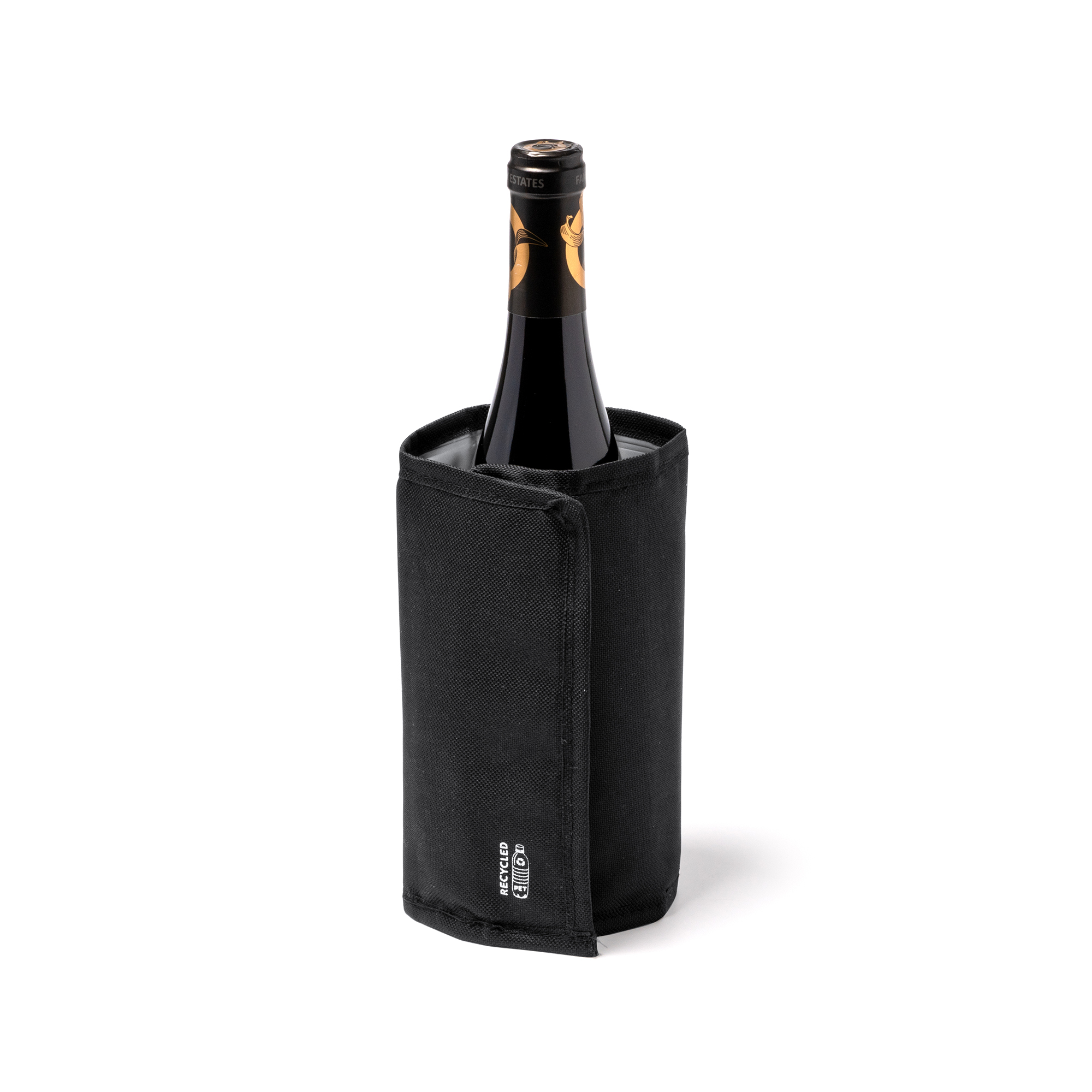 Enfriador de botellas realizado en RPET. Cierre ajustable de velcro.