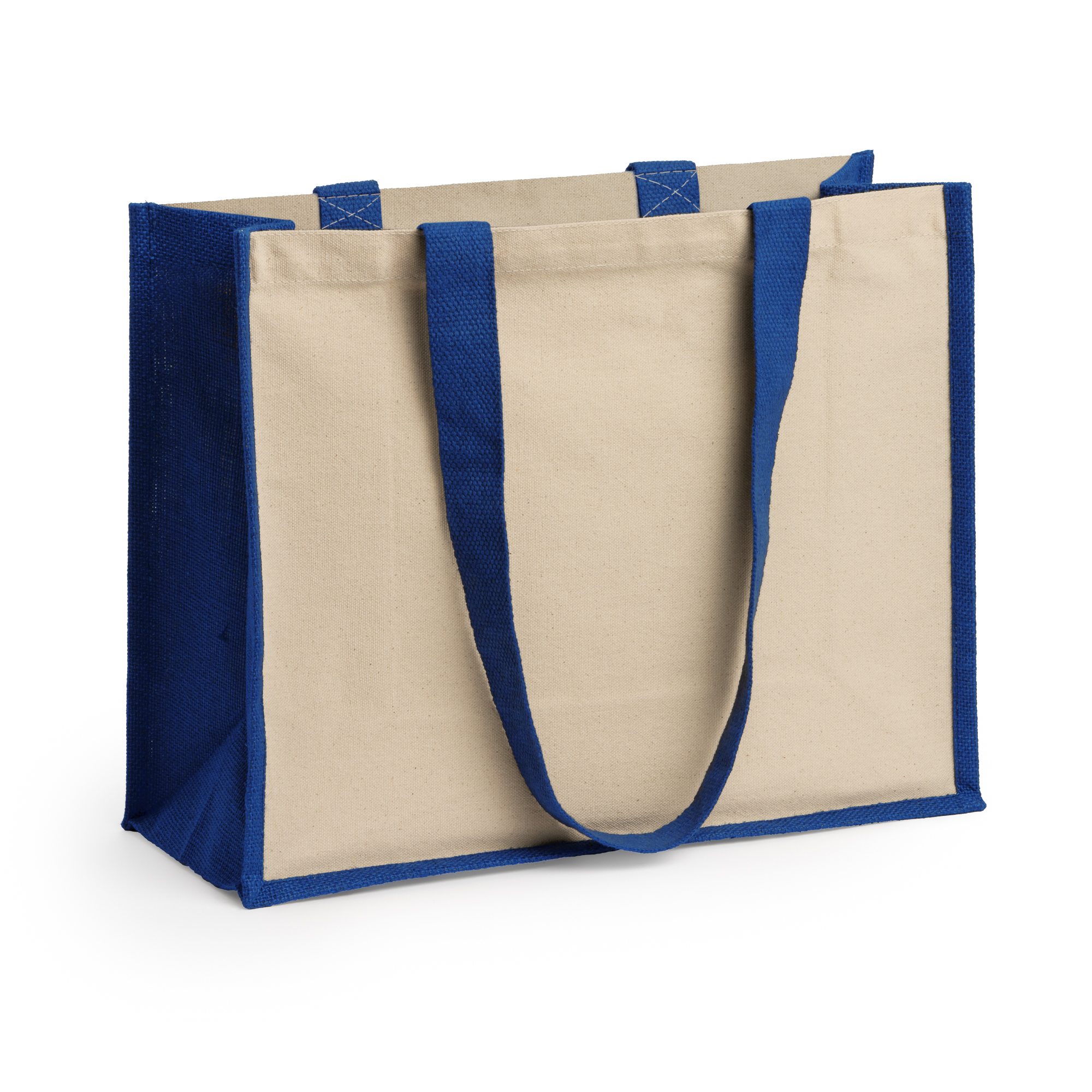 Bolsa de yute laminado con dos caras de algodón de 320 g/m², ideal para marcaje y asas largas. Su diseño combina color en detalles, laterales y asas a conjunto, y color natural en el cuerpo.